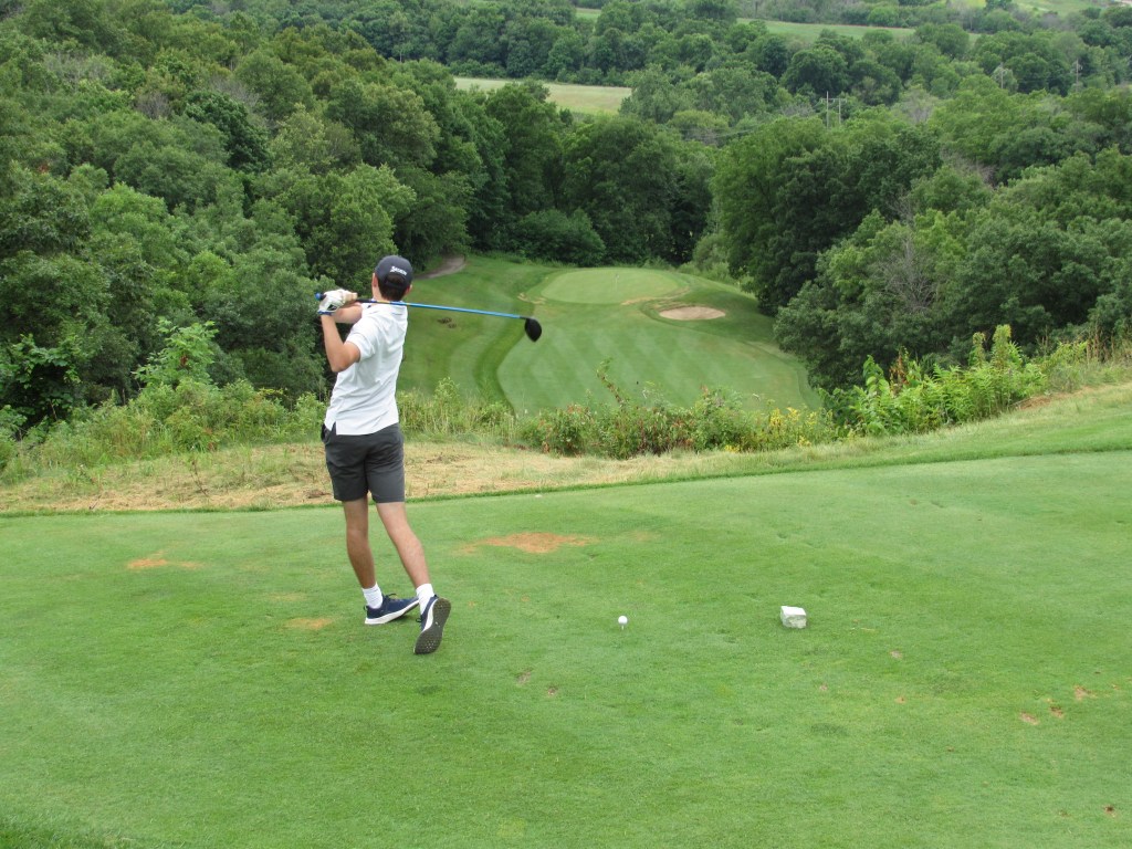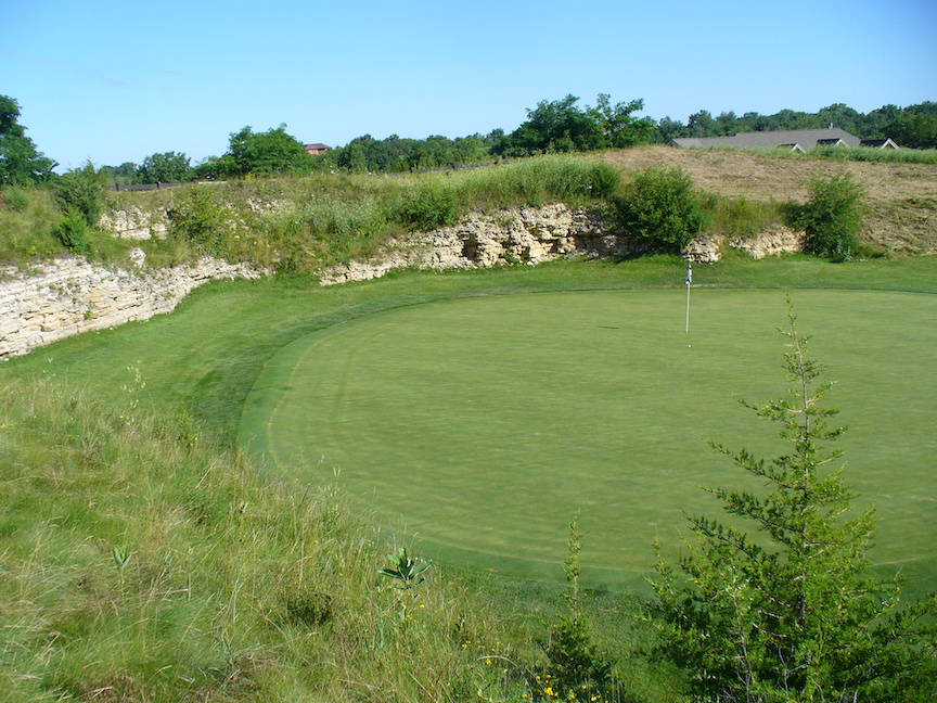 The fun really begins on the 165-yard, par-3 8th hole, which plays 50+ feet downhill to a massive green partially obscured by the edge of the teeing grounds. To the left of the green is a picturesque natural limestone stack, and, when you head down the hill, you realize you were also teeing off over a small inlet of Lake Galena. This is one of the most memorable holes on any of Eagle Ridge’s courses, and one of the prettiest one-shotters in the state.