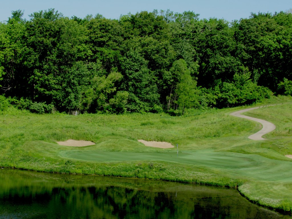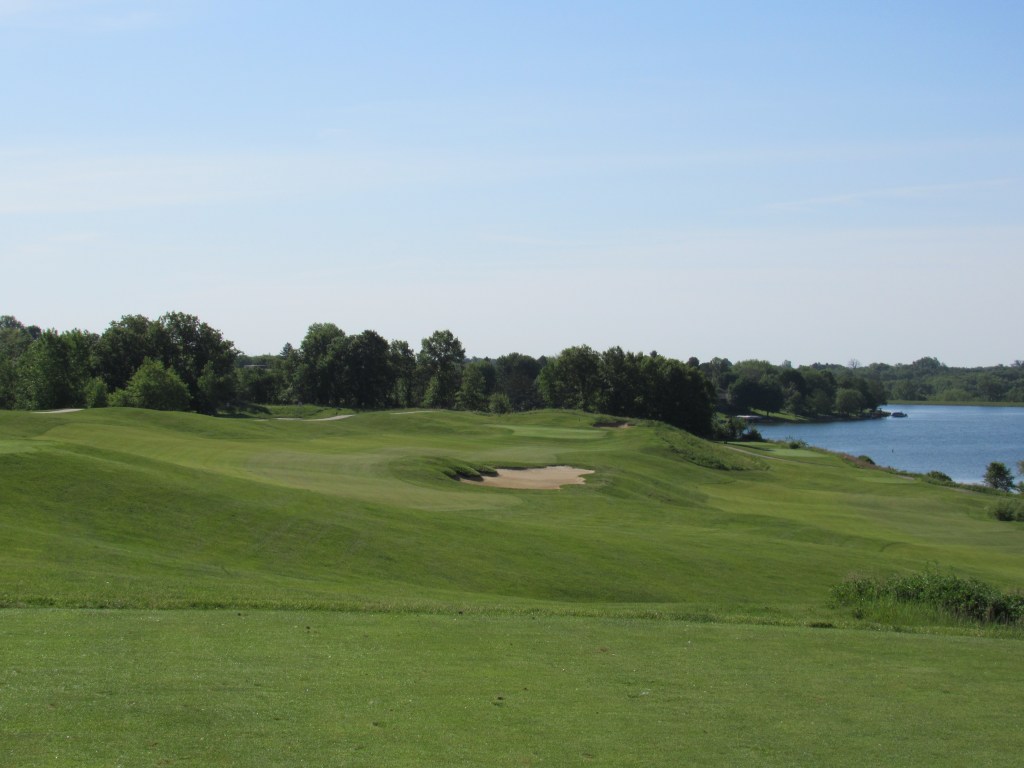 Personally, I also find the 372-yard 15th problematic, but probably because in the three times I’ve played Fyre Lake, I’ve averaged at least double-bogey. From any tees, there’s little visible fairway to aim at, and the reedy shore of the lake borders the left side from tee to green. If you’ve got a reliable power fade with your driver or fairway wood, you’re fine off the tee. But then your approach will need to carry water again to a small, mounded peninsula green. I have come to call this hole “The Devil’s Bathtub.”