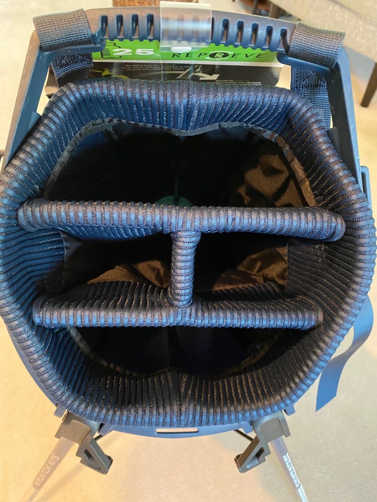 Despite the light weight, the pocket configuration is extremely accommodating. There’s room for the rain hood (included) and rain gear, extra towel, extra balls, and an umbrella. The specialized pockets include a lined valuables pocket, a pocket for a range-finder, and an oversized bottle sleeve. The clips at the top are convenient for a towel and a bag of tees. The graphite legs are very stable, and the well-padded, dual-straps are easy-on, easy-off.