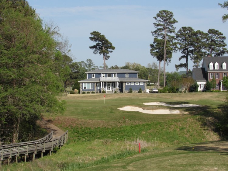 In 1975, Pete Dye was coming into his own as a golf course architect. He was entering the stage of his career – and an age of golf – when course difficulty was considered a paramount virtue (from the tips, Course Rating: 73.2; Course Slope: 136). The rolling topography along the James River lent itself perfectly into Dye’s penchant for visual deception: when players can’t see the ground between themselves and their targets because of swales or valleys, yardages are much harder to estimate. And in the 1970s, laser rangefinders weren’t a thing yet. Today, even with modern yardage-measuring devices, recreational golfers have trouble overcoming doubts – many carries over hazards and up to predominantly elevated greens look much longer (and occasionally even shorter) than the laser says. (Buy a Player’s Book in the proshop – very useful!)