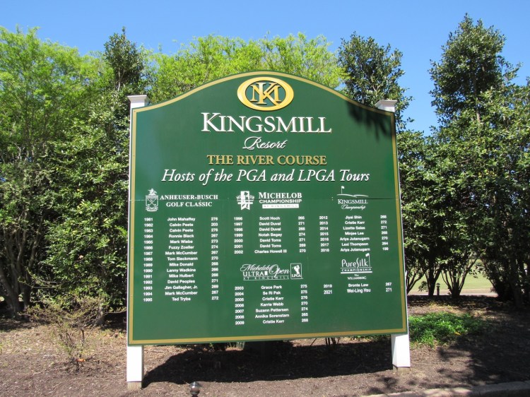 Another historical record greets you as you walk towards the front of the clubhouse – a large sign listing all the names of the winners of the multiple professional tour tournaments competed on the Kingsmill River Course over the decades: Anheuser-Busch Golf Classic, Michelob Championship at Kingsmill, Michelob Ultra Open at Kingsmill , Kingsmill Championship, and PureSilk Championship of Williamsburg. One of these tournaments ran close to annually from 1961 to 2021. When asked why the tours stopped coming to Kingsmill, one of the staff said, “They hit the ball too far these days. There’s no room to expand the course.”