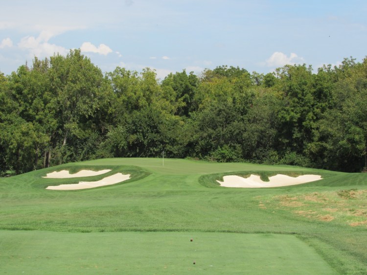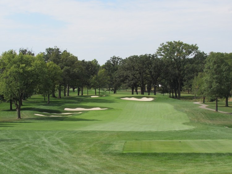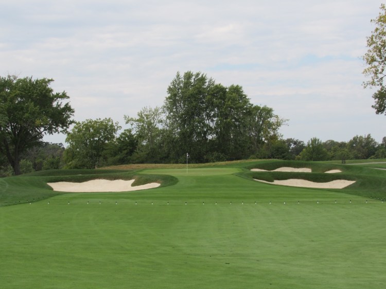 There are 89 bunkers on Dubs, all of which have recently been rebuilt and filled with snowy-white sand from Ohio (where the best bunker sand in the world is found). According to Troy Newport, General Manager of Cog Hill, the granular structure of this sand is such that it sort of locks together and doesn’t wash down the faces of the bunkers, even during midwestern gutter-washers. I can attest to the bunkering’s impeccable grooming, given that I found myself in greenside bunkers on at least half of the holes. The bunker design throughout is epitomized by the one fronting the 5th green – steep faced craters that usually leave you with little to no view of the putting surface.